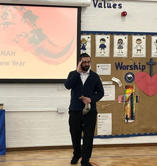 Rabbi Nick explaining and talking to the whole school about the Jewish Festival, Rosh Hashanah